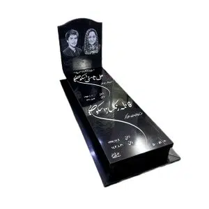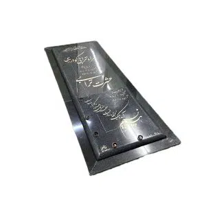 سنگقبر طرح زمرد اجراء شده با سنگ مشکی گزانیت که سنگی مستحکم بوده و برای اجراء در هر نوع شرایط آب و هوایی مناسب است در این نمونه از کتیبه ای از جنس سنگ اصلی