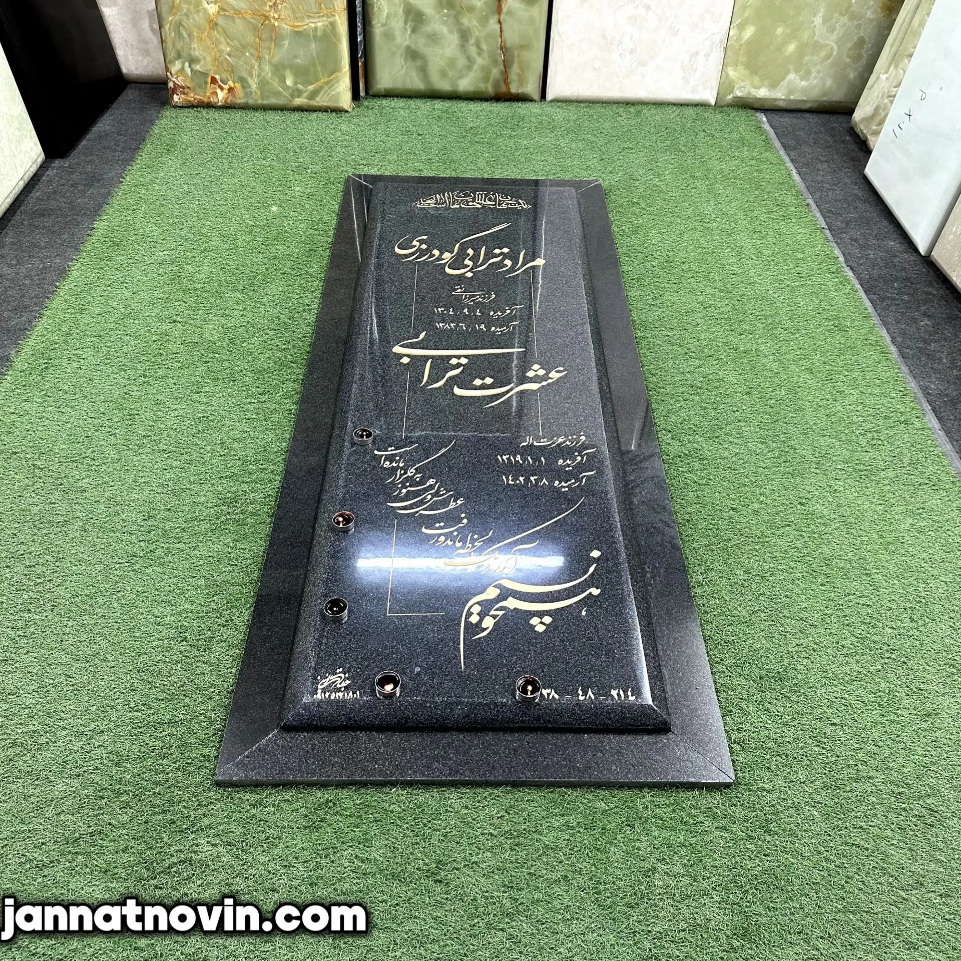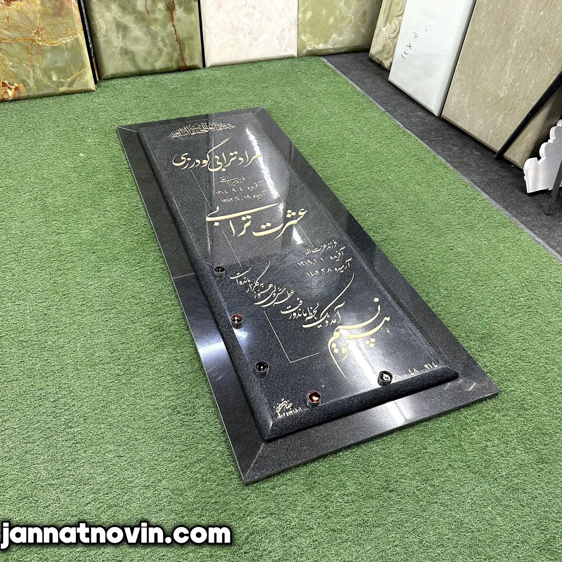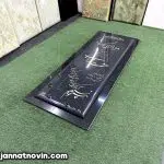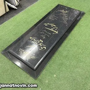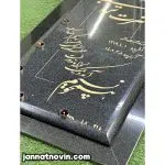طراحی و حکاکی متن در این نمونه به وسیله هنر دست اجرا شده و با رنگ طلایی اشرفی رنگ آمیزی شده است که با فونت زیبایی که دارد جلای مزار را دوچندان کرده است