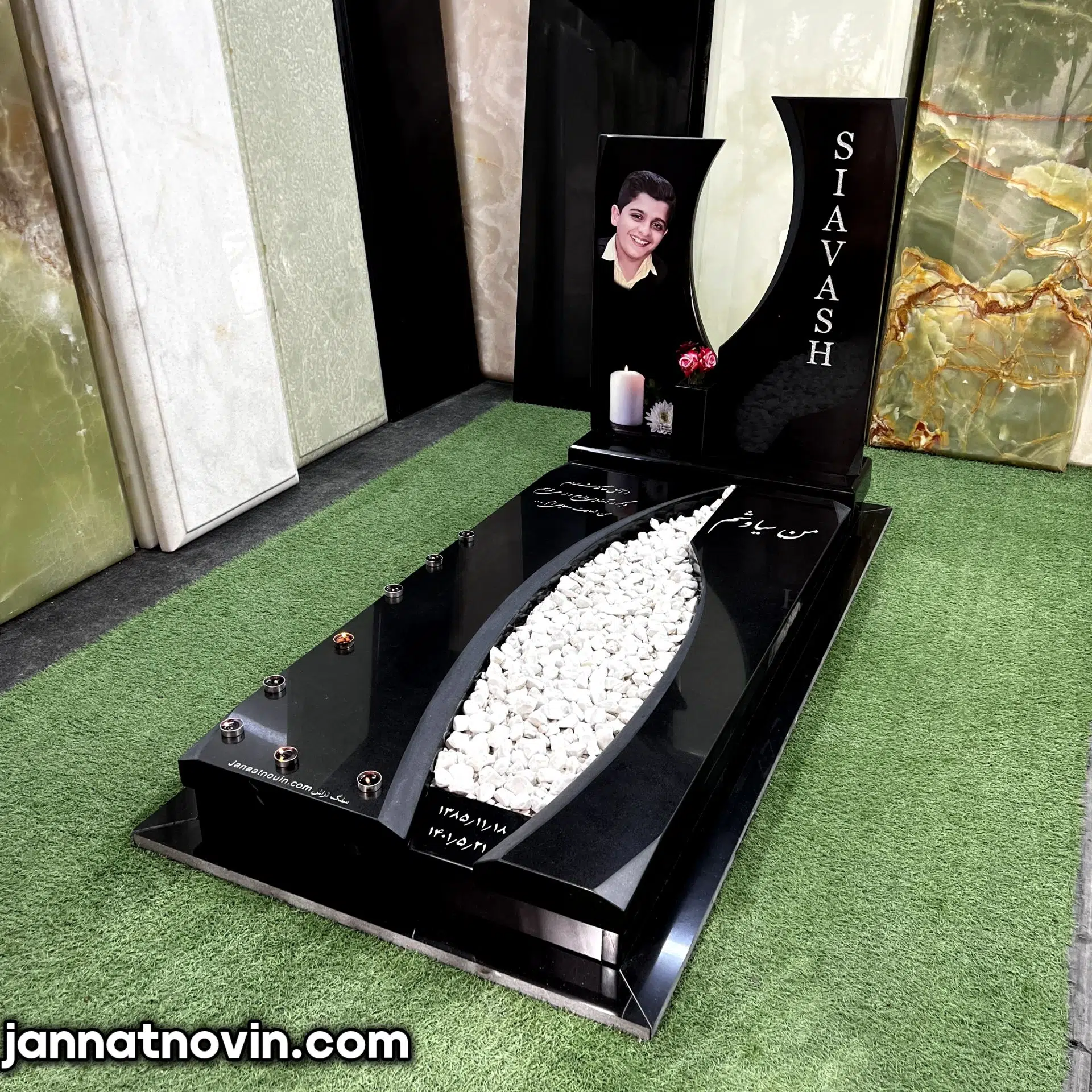 سنگ مزار طرح گلدیس تماما اجراء شده با سنگ گرانیت برزیلی که بهترین سنگ مشکی شناخته شده و دارای استحکام بالایی بوده و بسیار در ساخت سنگ مزار استفاده میشود