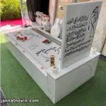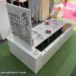 سنگ مزار طرح گلدیس با متریال اجرائی تماما سنگ مرمریت هرات افغانستان؛دارای کتیبه وباکس به همراه طرح جاشمعی در دو سمت کتیبه؛طرح باغچه دریک سمت مزار و دودست قرنیز دور تادور مزار