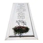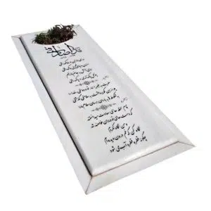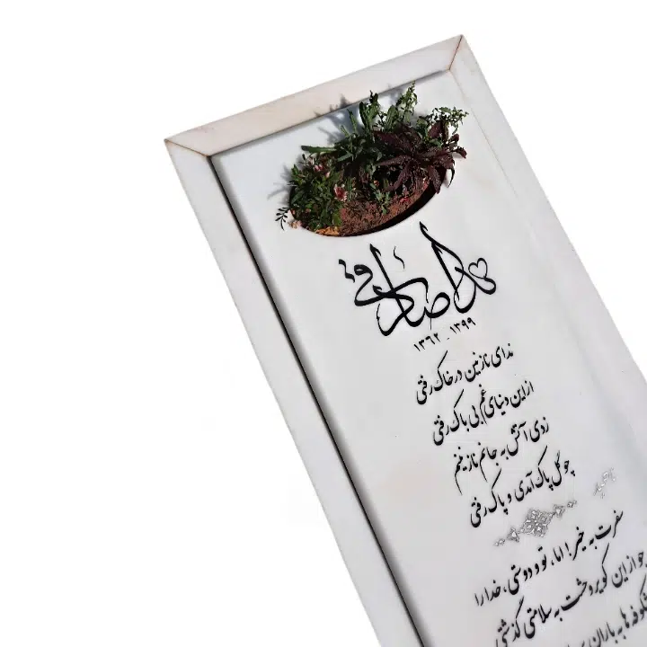 سنگی سفید و یک دست با حاله های سبز و کرمی رنگ به همراه قرنیز مشکی گرانیت که حکاکی متن سنگ کامپیوتری تراشیده شده