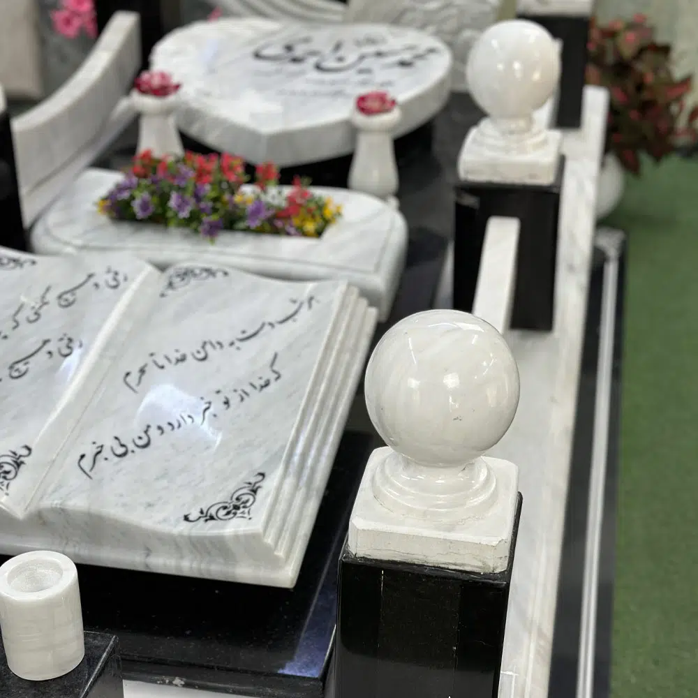 نردههای سنگی بهصورت تلفیقی و با گویهای سنگی ساخته شده که جزئیات آن بهصورت دستی پرداخت شده است. نوشتار سنگ بهصورت کامپیوتری اجرا شده و در حاشیهها امکان درج آیات یا اشعار فراهم شده است. عکس رنگی سرامیکی با کیفیت مرغوب نیز بر روی کتیبه یا بخشهای مربوطه نصب میشود تا دوام تصویر در برابر شرایط محیطی حفظ شود.