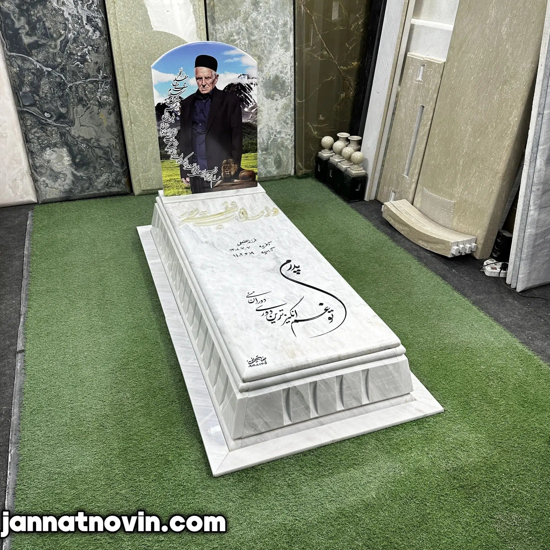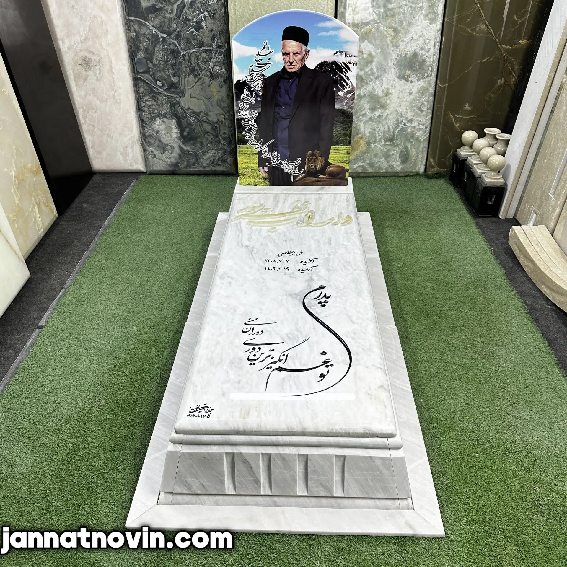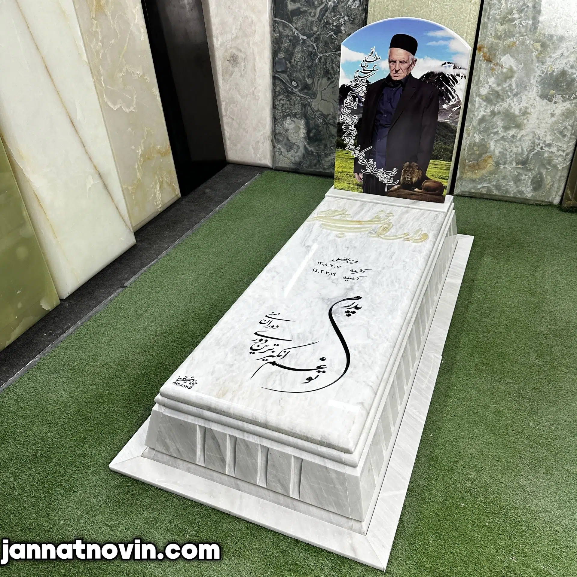 دراین نمونه از کتیبه ای از جنس سنگ اصلی استفاده شده و چاپ عکس روی این کتیبه به وسیله چاپ عکس لیزری سیاه سفید که تدائی کننده خاطرات است انجام شده است