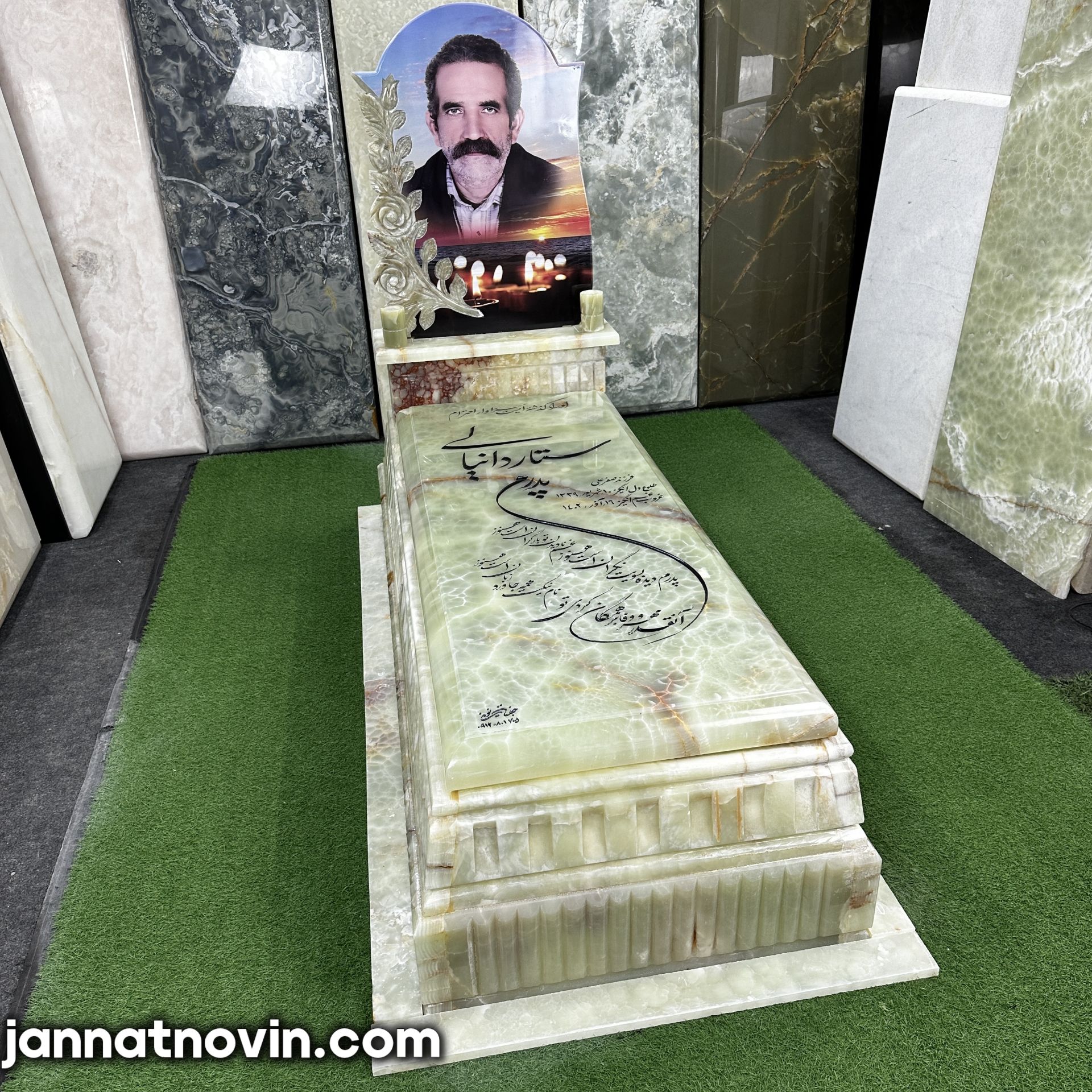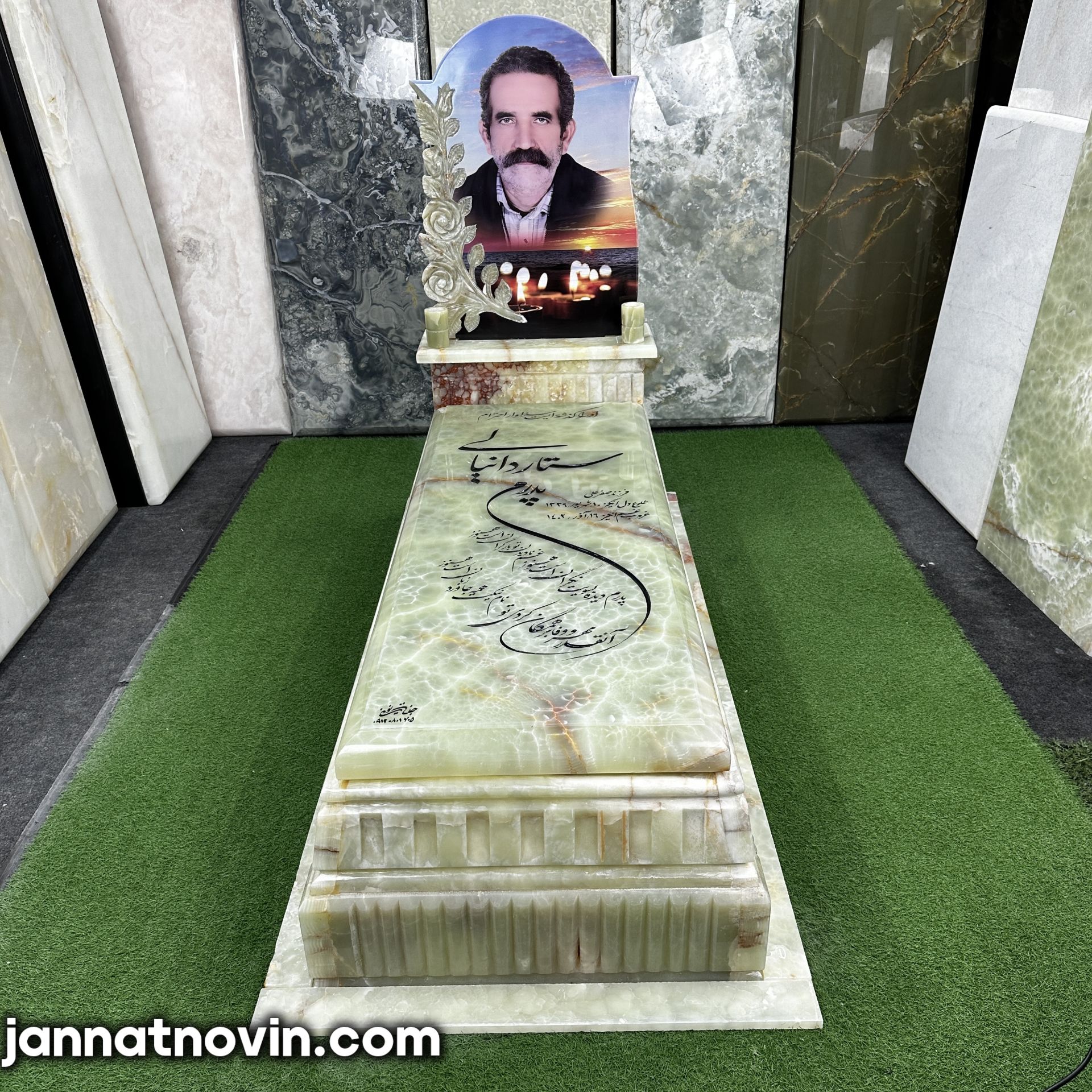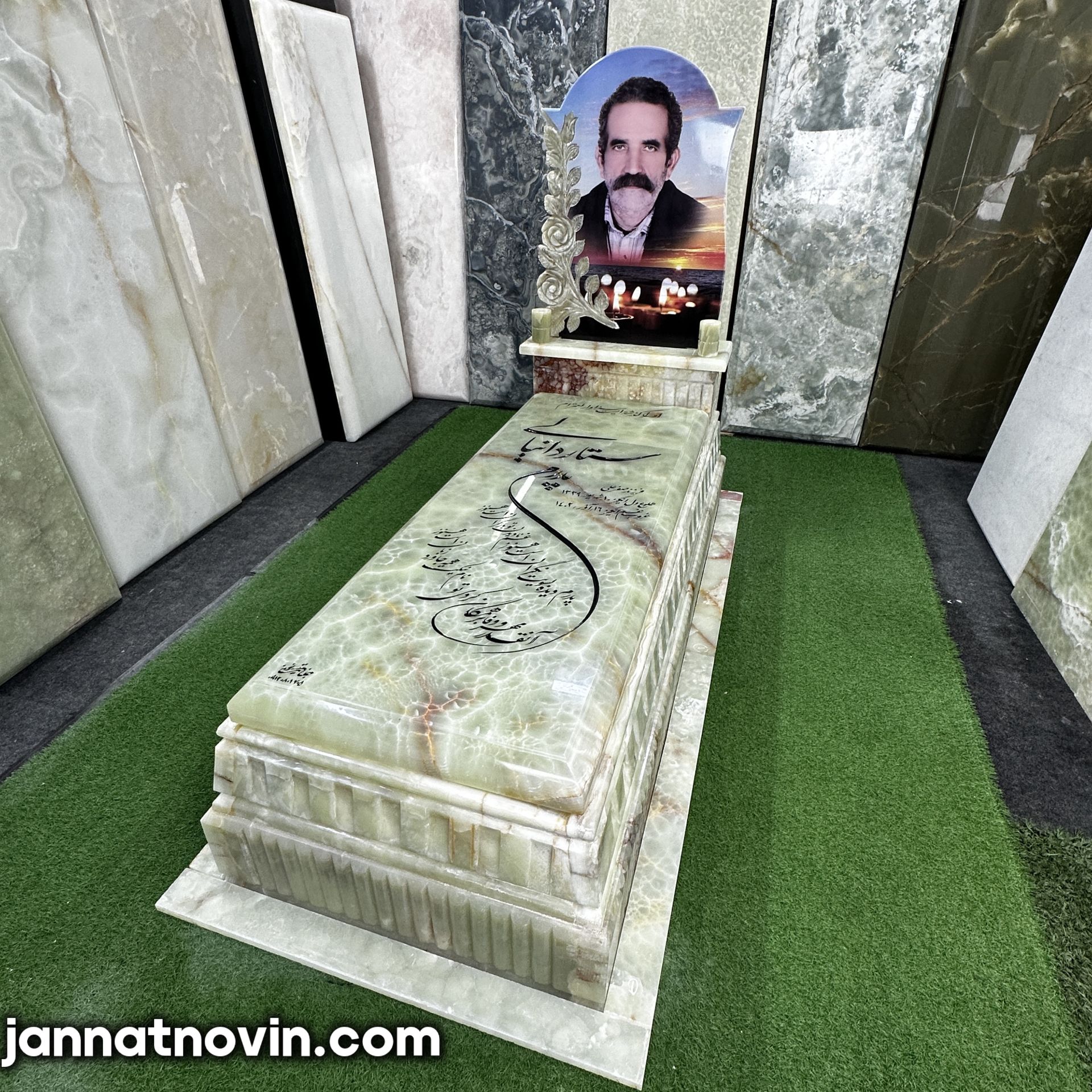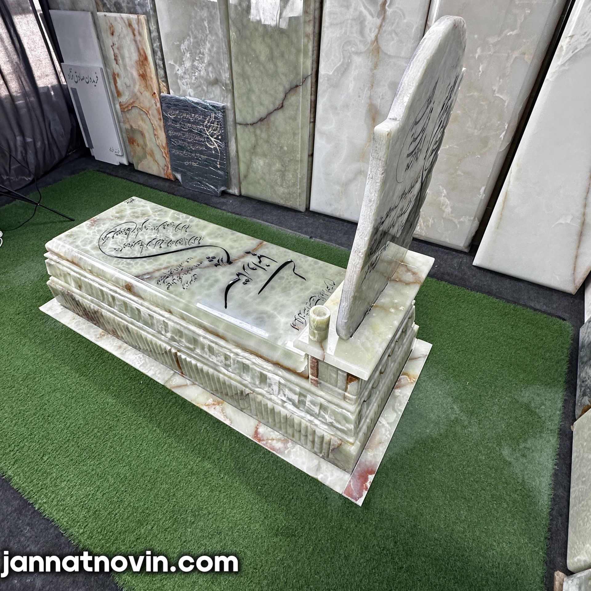 سنگ مزار طرح پردیس اجراء شده با سنگ مرکر سبز آذر شهر بوده که دارای جنسی با مقاومت و استحکام بالا بوده و دارای بافتی خاص است و به دلیل استحکام بالا این سنگ بسیار در ساخت سنگ مزار مورد استفاده قرار میگیرد.
