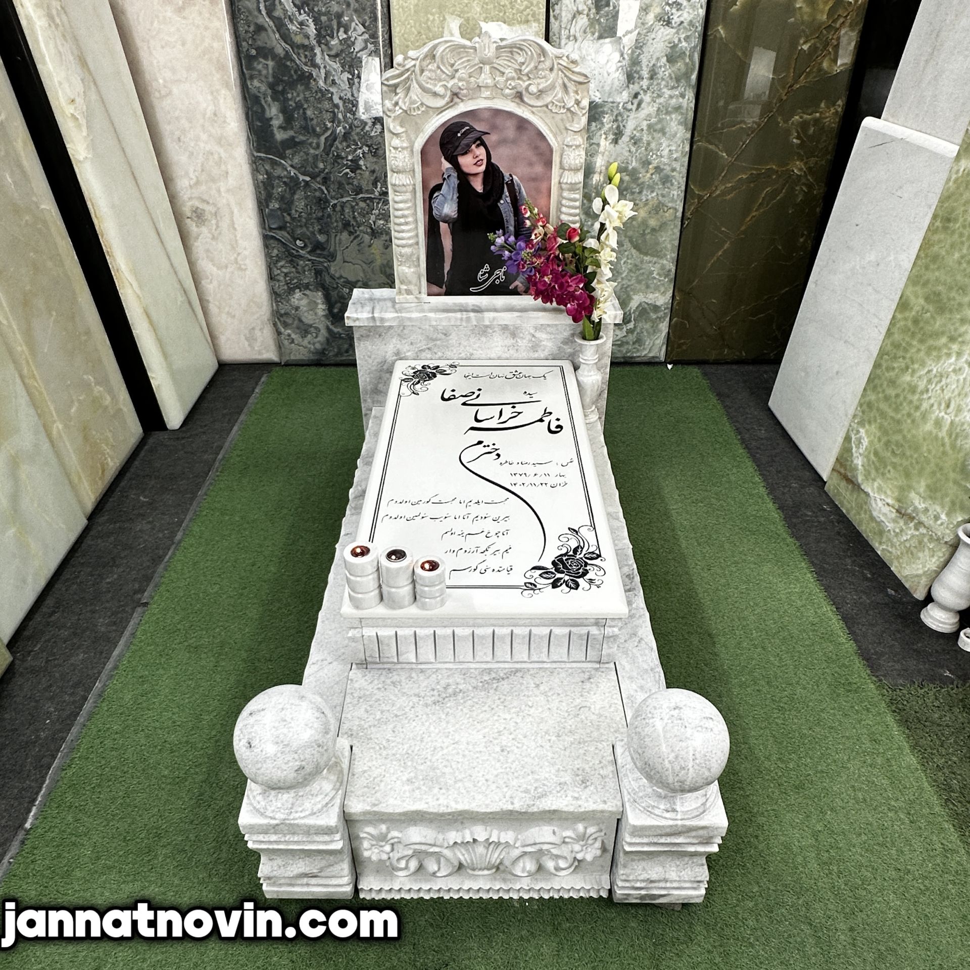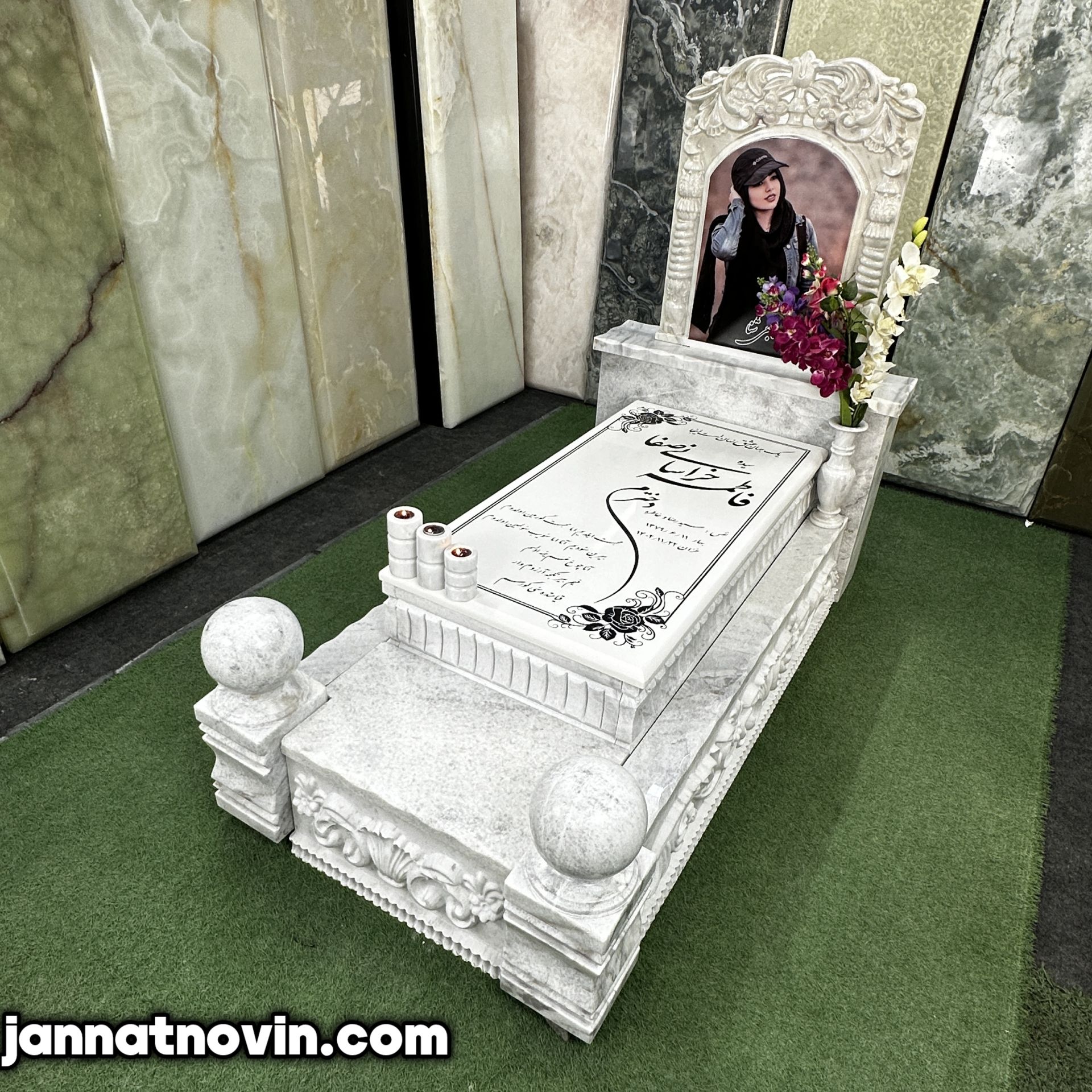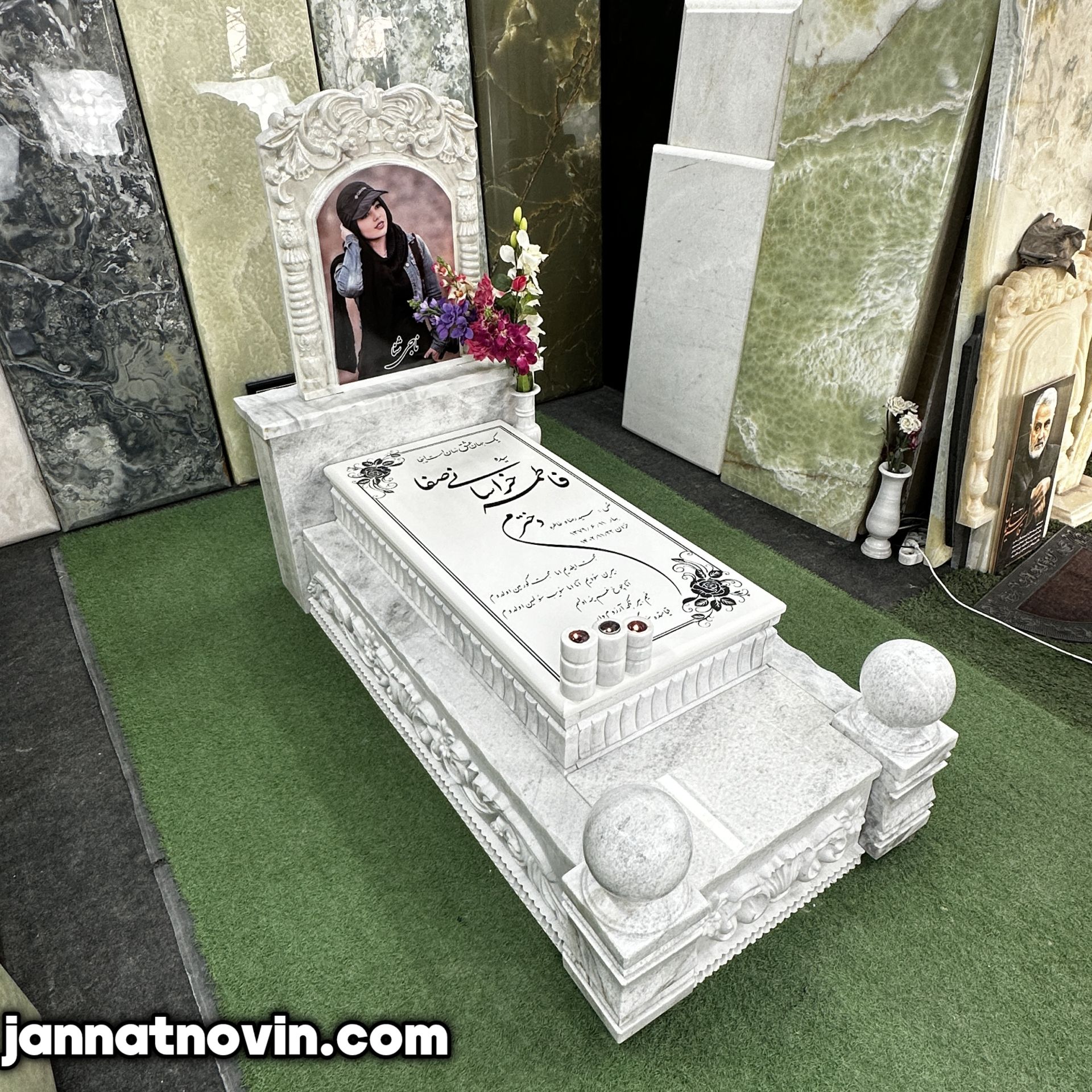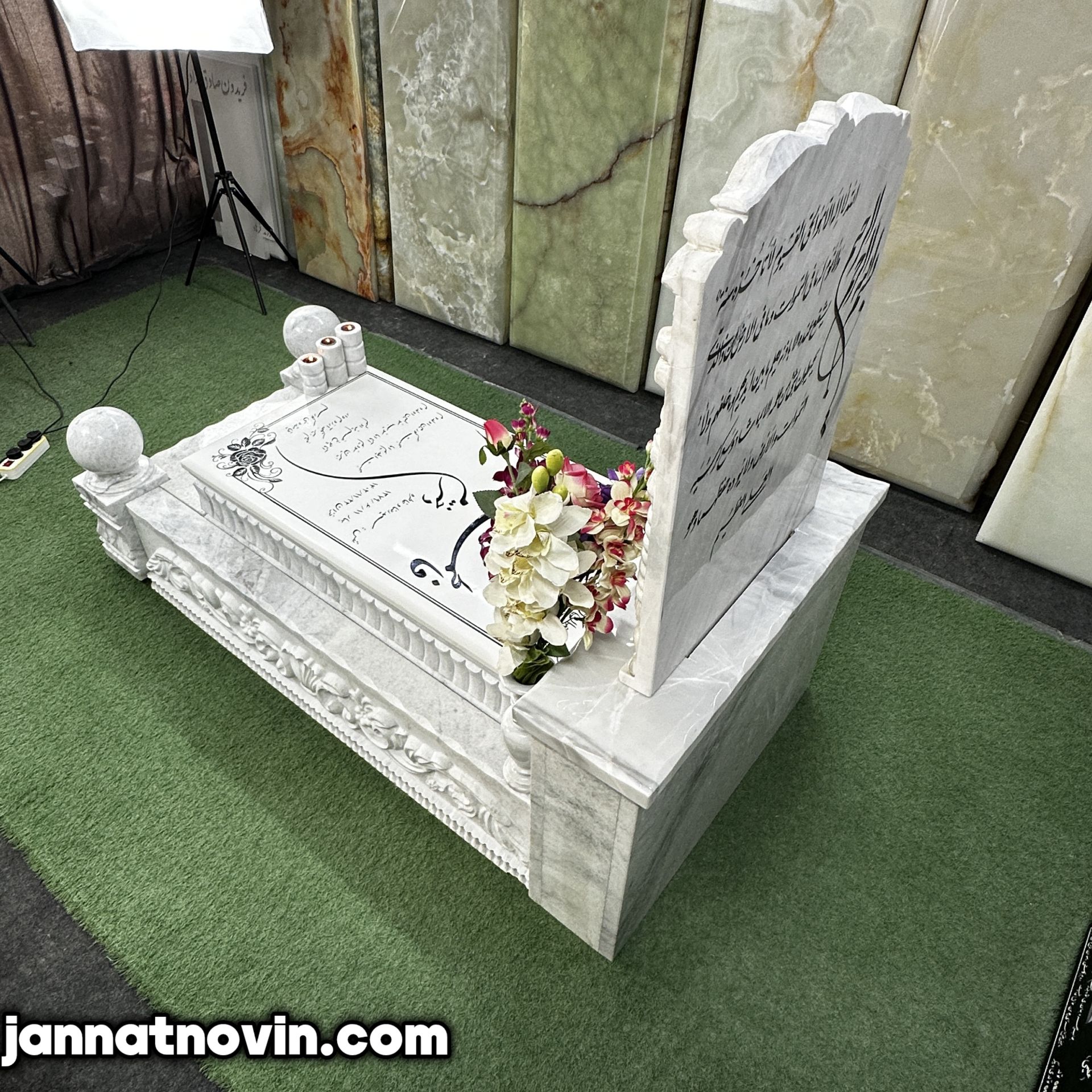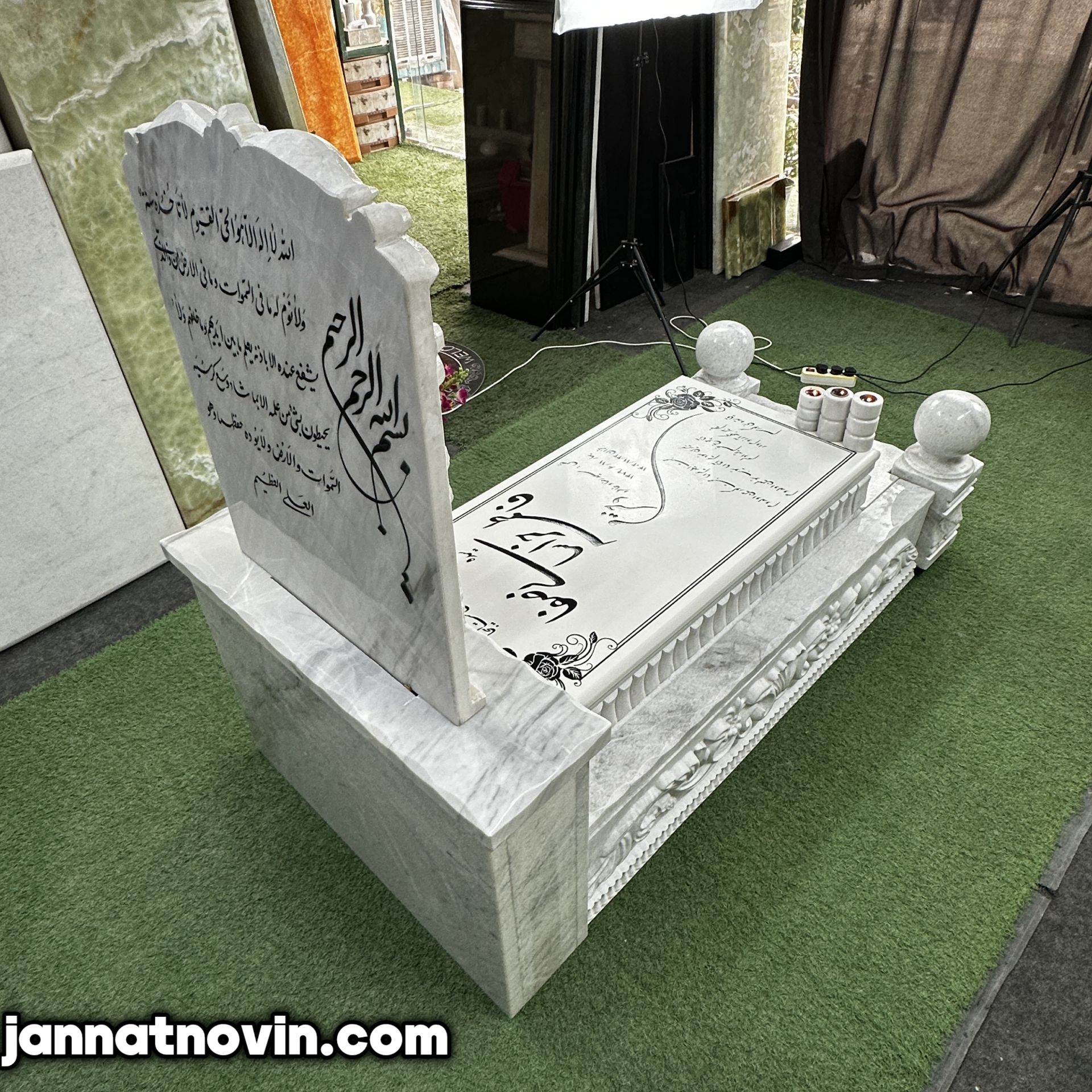 سنگ مزار طرح پردیس اجراء شده با تلفیق سنگ بسیار مقاوم وزیبای نانو و مرمریت که دارای جنسی با مقاومت و استحکام بالا بوده و دارای بافت رگه ای مانند بوده و به دلیل استحکام بالا این سنگ بسیار در ساخت سنگ مزار مورد استفاده قرار میگیرد
