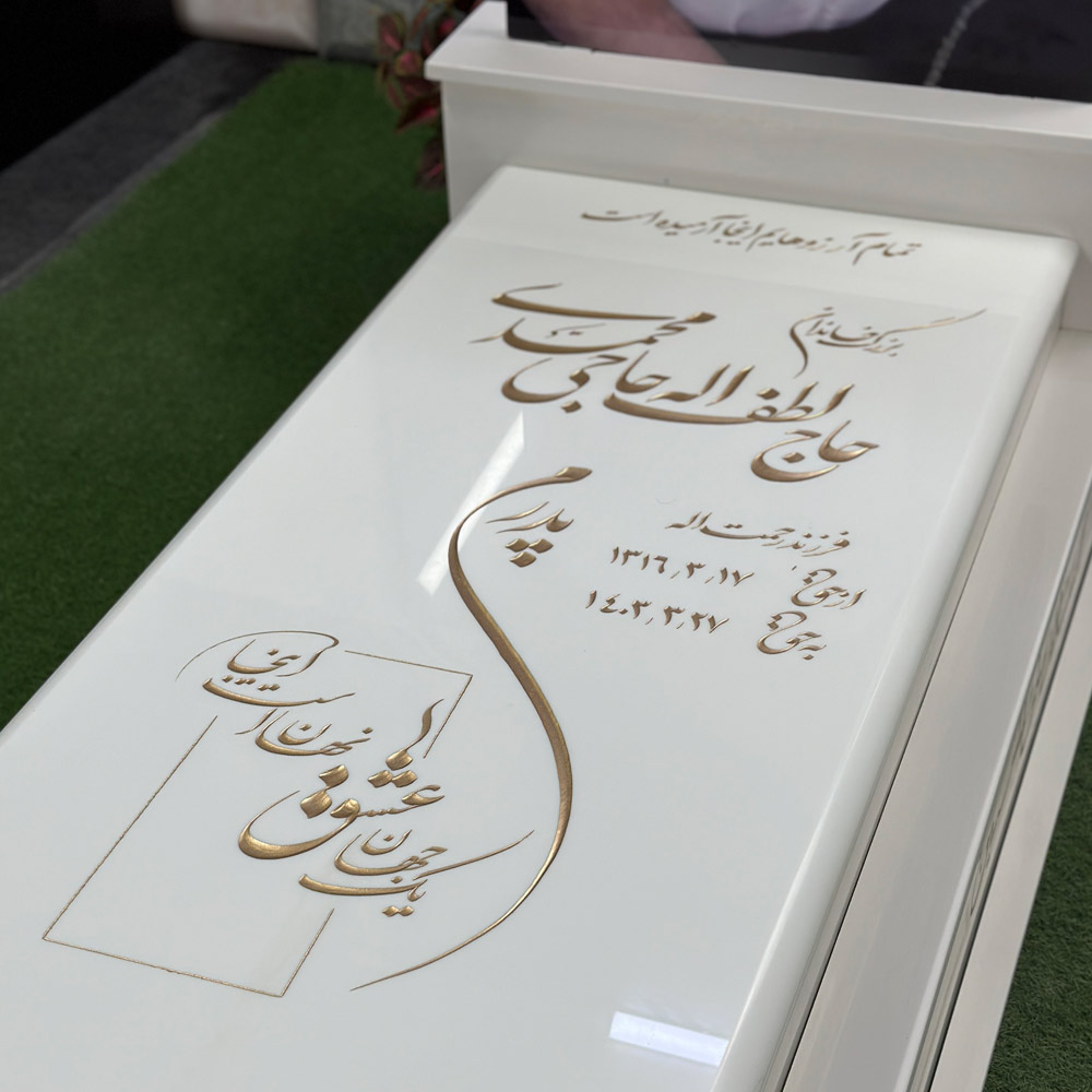 این مدل با سنگ سفید یکدست خارجی نانو A اجرا شده که سطح یکنواخت و رنگ ثابت آن برای کارهای ساده و مرتب مناسب است. ضخامت سنگ ۳ سانتیمتر در نظر گرفته شده و اجرای طرح بهصورت پلهای انجام شده تا ارتفاع کلی از سطح زمین به ۴۰ سانتیمتر برسد. ساختار کار بهگونهای طراحی شده که تفکیک بخشها واضح باشد و نظم کلی مزار حفظ شود. در بخش کتیبه، باکس مخصوص برای نصب عکس رنگی پیشبینی شده تا تصویر با وضوح مناسب و جانمایی دقیق اجرا شود.