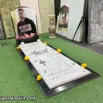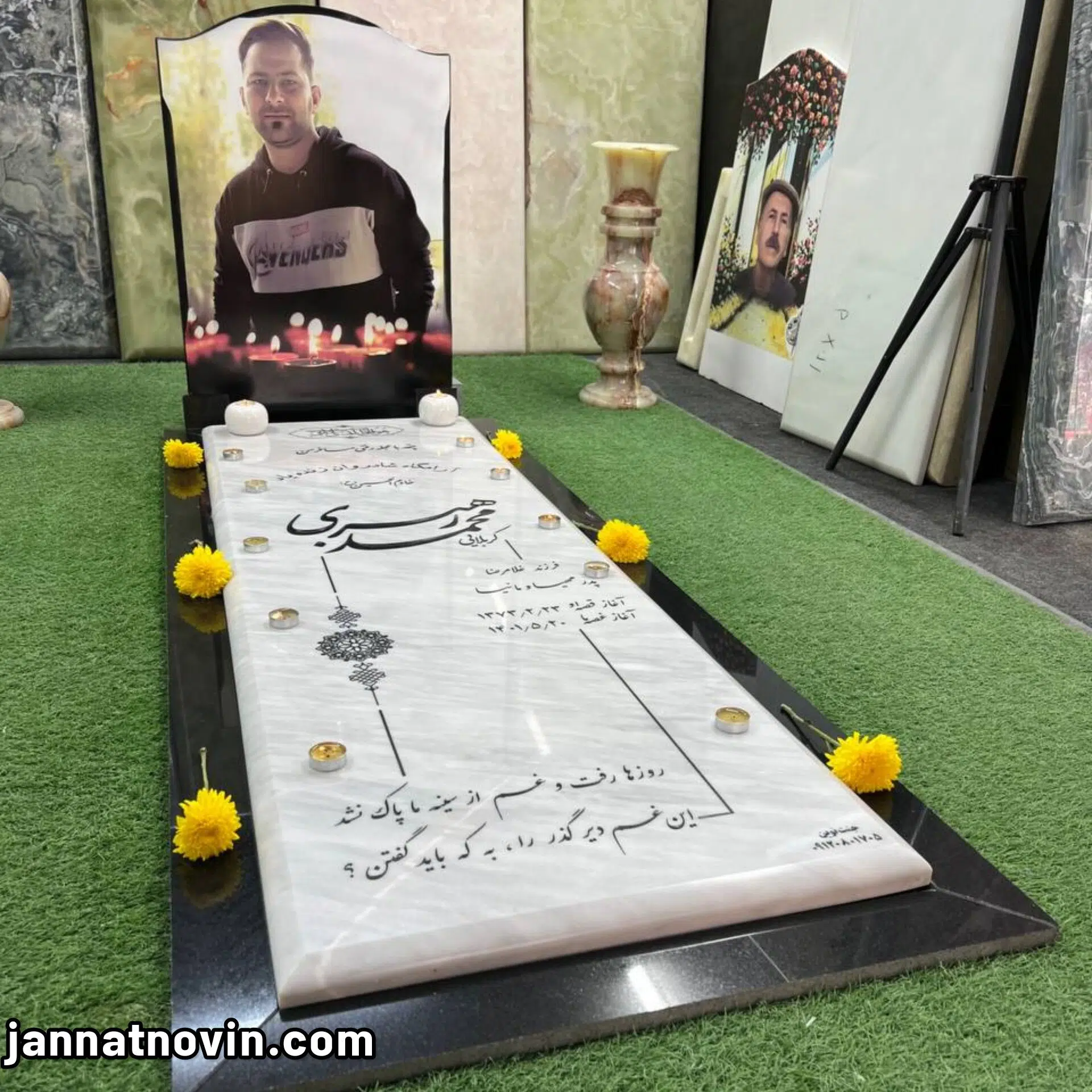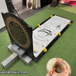 همچنین در این نمونه کتیبه ای با جنس گرانیت اصفهان نصب شده که روی کتیبه چاپ عکس به صورت رنگی (uv) باکیفیت و لوزیشن بالا اجراء شده که تدایی بخش خاطرات نیز می باشد؛در انتها نیز برای عرفانی نمودن محیط اطراف از دو جاشمعی در دوسمت بالایی مزار استفاده شده که زیبایی طرح را نیز در عین سادگی دوچندان کرده است