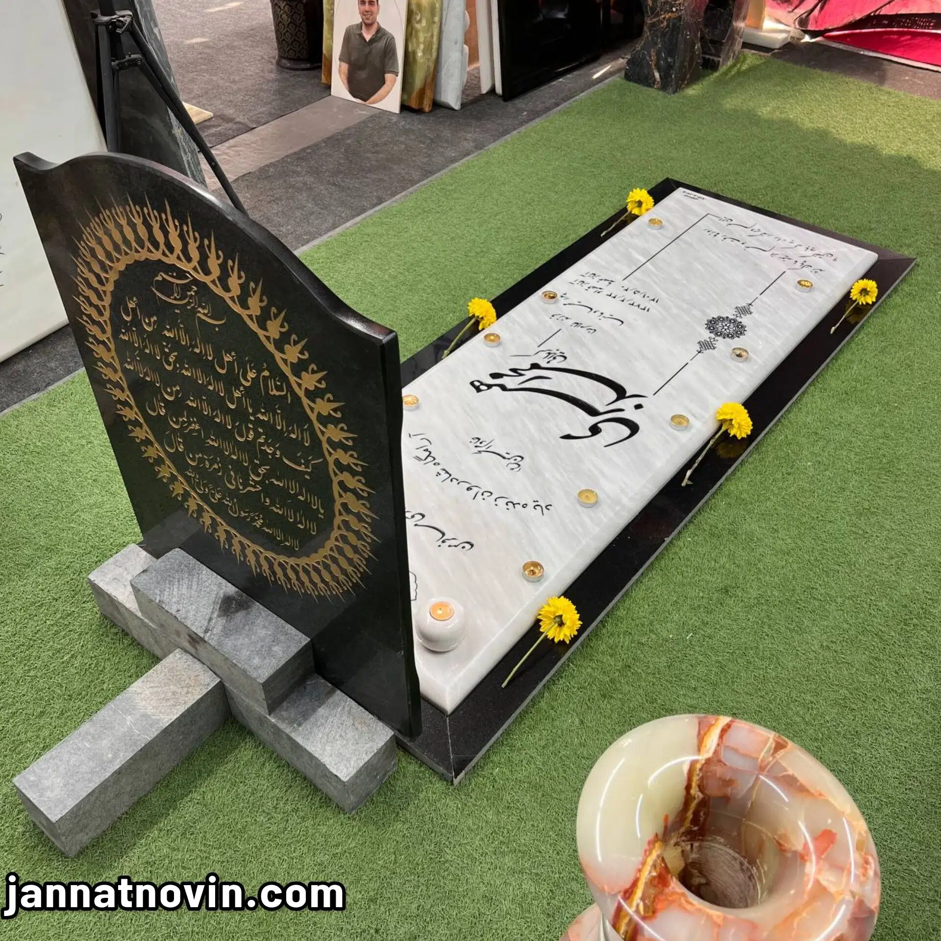 سنگ مزار طرح نگین اجراء شده با تلفیق سنگ مرمریت ازنای لرستان به عنوان سنگ پلاک وسنگ گرانیت اصفهان به عنوان قرنیز و کتیبه