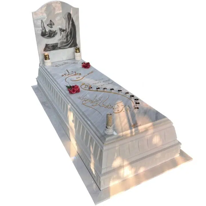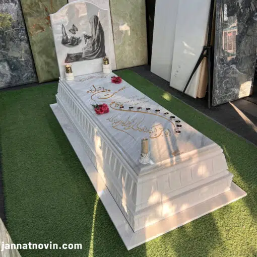 دراین نمونه از کتیبه ای باجنس اصلی سنگ استفاده شده که روی کتیبه از چاپ عکس لیزری سیاه سفید باکیفیت به شکل مادر در حال عبادت به همراه عکس شمع گل و پروانه استفاده شده که نشان از فداکاری و قلب پاک مادران آسمانی بوده که هرزمان برای سعادت فرزندانش دعا کرده وخود وخواستهایش را فدای آنها میکند