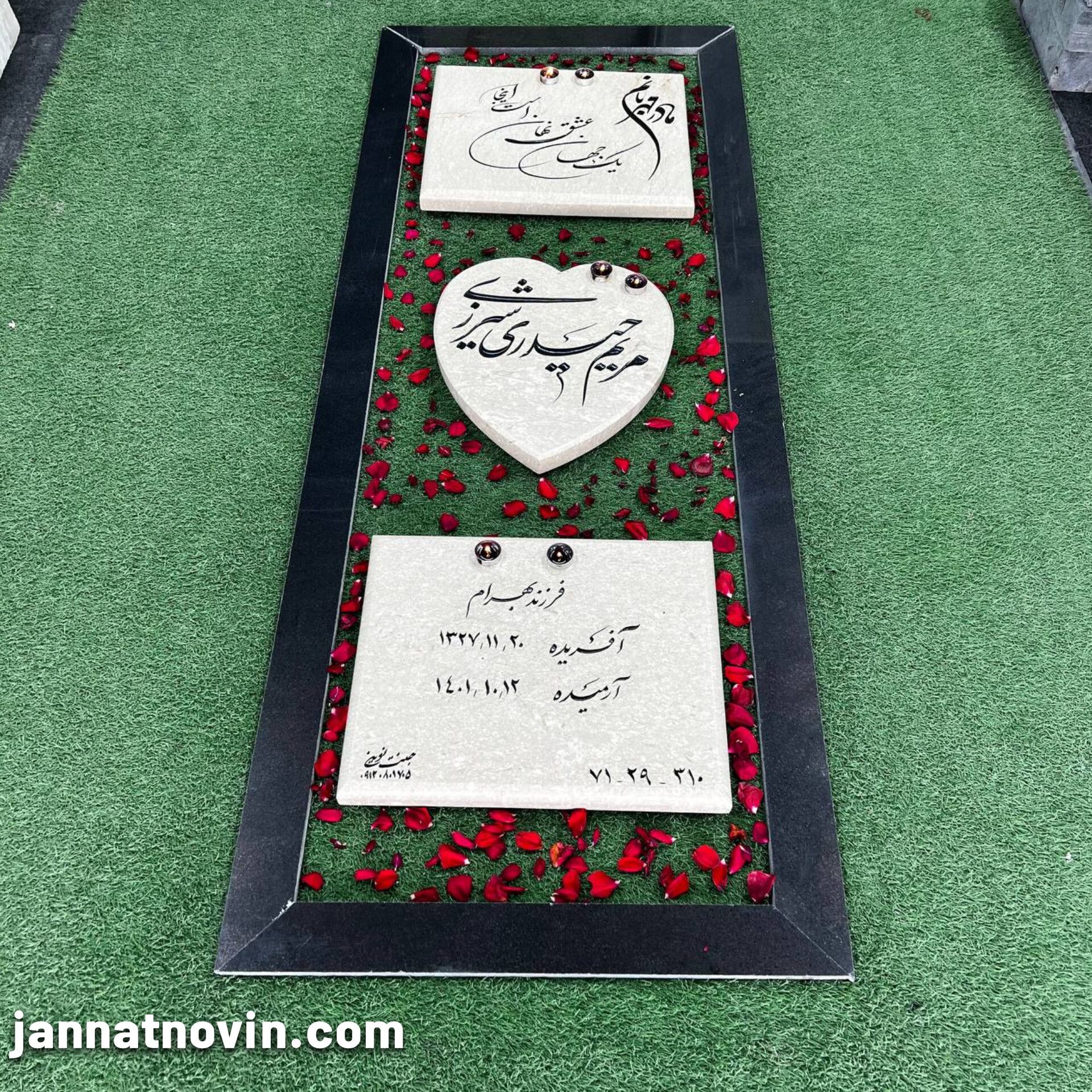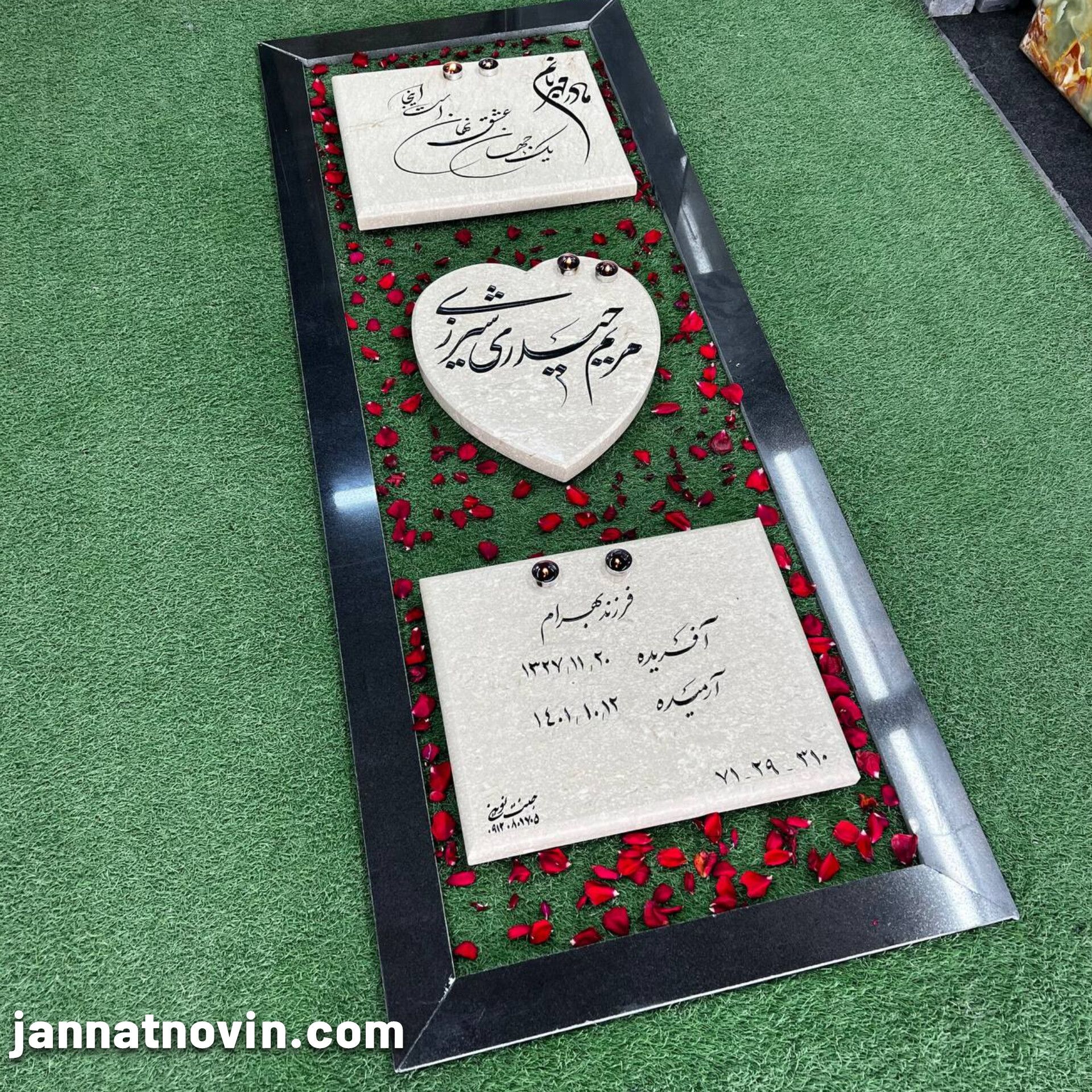 سنگ مزار طرح قلب اجراء شده با تلفیق سنگ مرمریت خوی و گرانیت بوده که این سنگ دارای جنسی با مقاومت و استحکام بالا بوده و دارای رنگ روشن وخاص است؛این دو جنس سنگ بسیار در ساخت سنگ مزار مورد استفاده قرار میگیرند