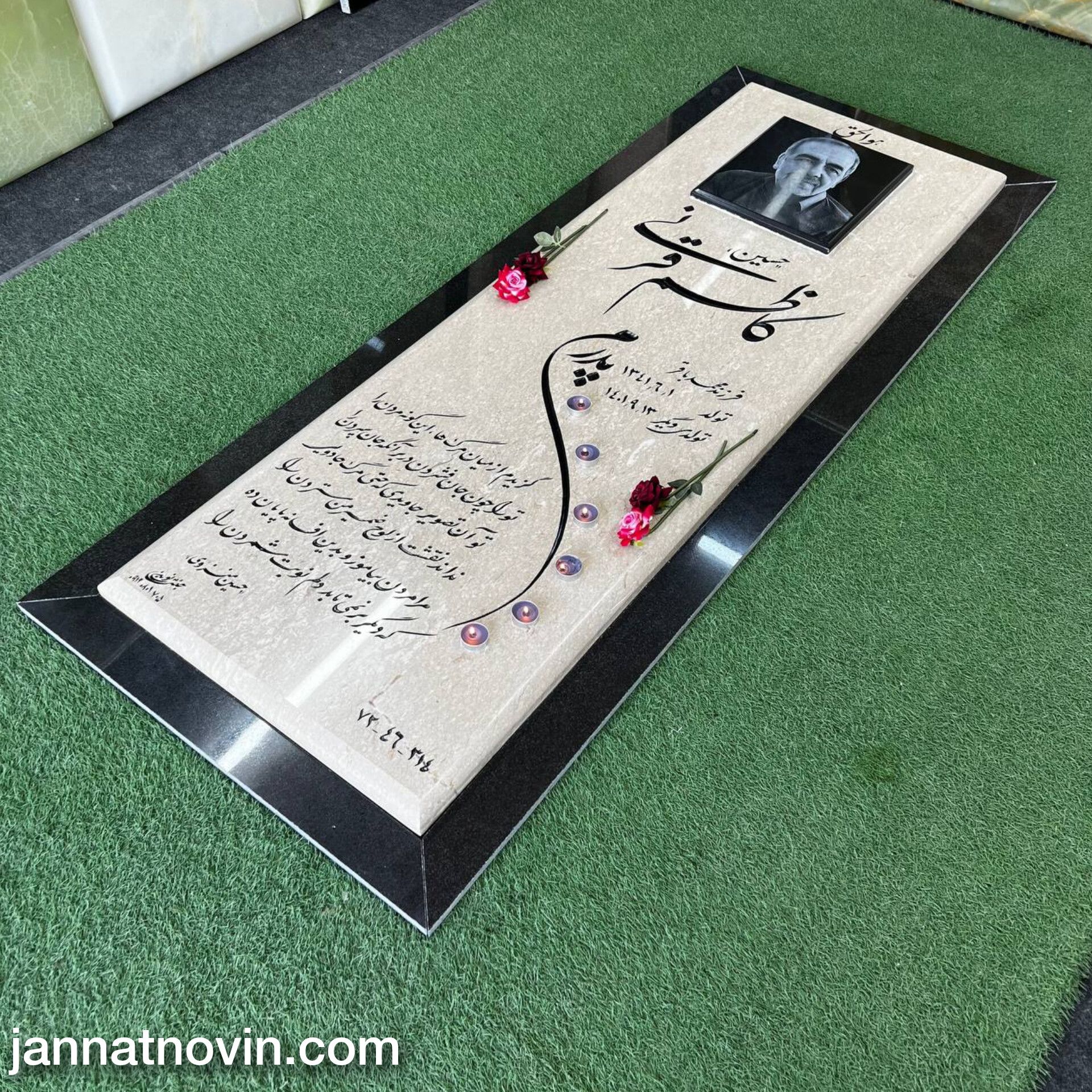 سنگ مزار طرح نگین اجراء شده با سنگ مرمریت خوی به همراه یک دست قرنیز گرانیت دور