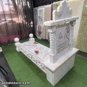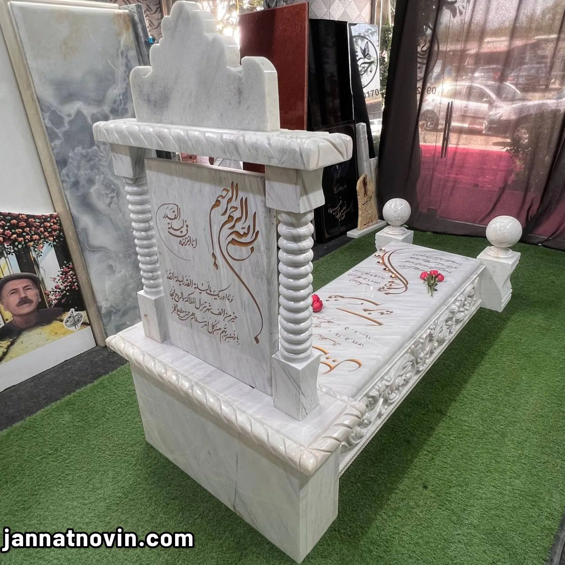 سنگ مزار طرح یاس با متریال اجرائی تماما ساخته شده با سنگ مرمریت ازنای لرستان که دارای استحکام و مقاومت بالایی بوده و با رنگ سفید به همراه رگه های طوسی که دارد بسیار در ساخت سنگ مزار مورد استفاده قرار میگیرد