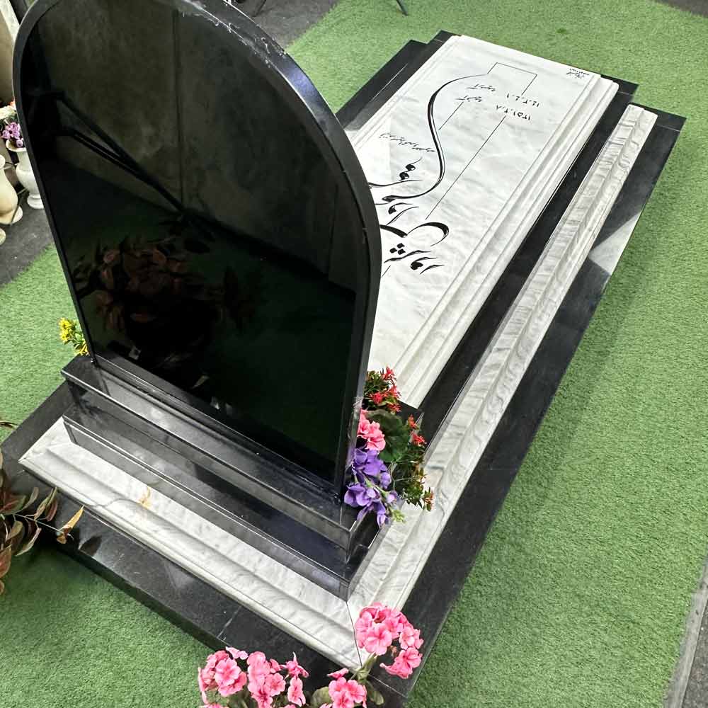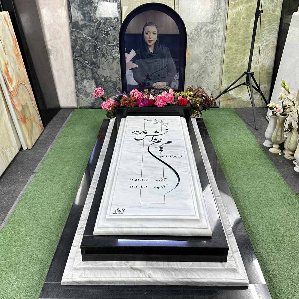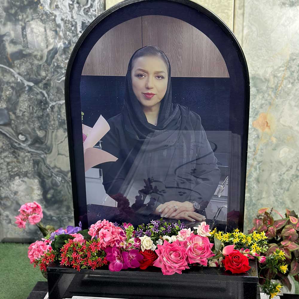 نوشتار متن سنگ بهصورت دستی و با زیبانویسی انجام میشود تا خوانایی و جلوه خط حفظ شود. تصویر متوفی بهصورت عکس پلکسی A اجرا شده که وضوح مناسب و ظاهر منظمتری نسبت به چاپهای معمول دارد. پرداخت سطح سنگ و اجرای جزئیات بهصورت دقیق انجام شده تا ترکیب سنگ مشکی و سفید بهصورت هماهنگ دیده شود.